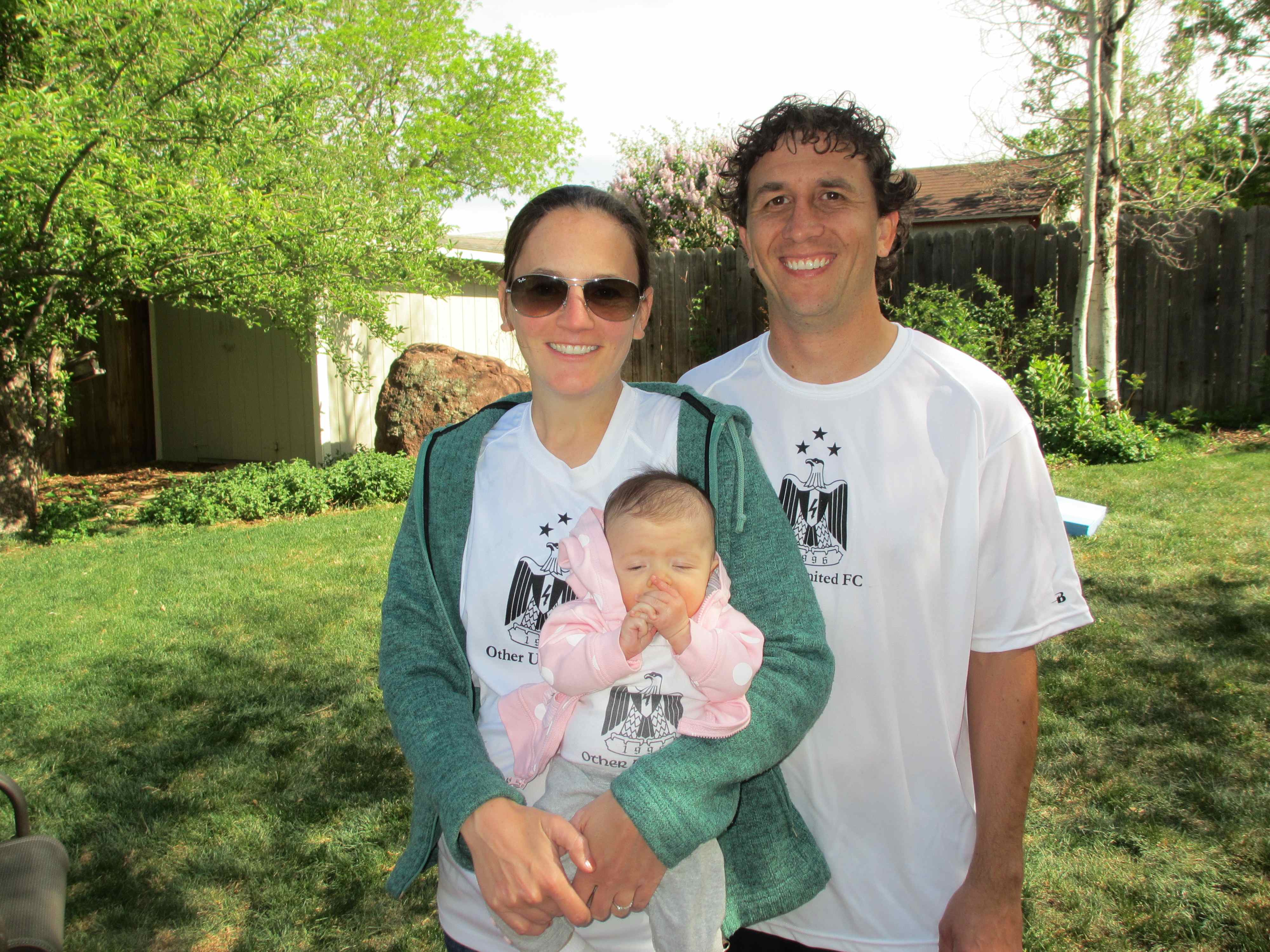 Today we had a soccer BBQ at our house (following the first win that you’ve ever witnessed by our team; it’s been a rough season). Everyone on the team enjoyed holding you and you had fun with all the company. You had on your little ‘Other United’ onesie and matched your dad and I.