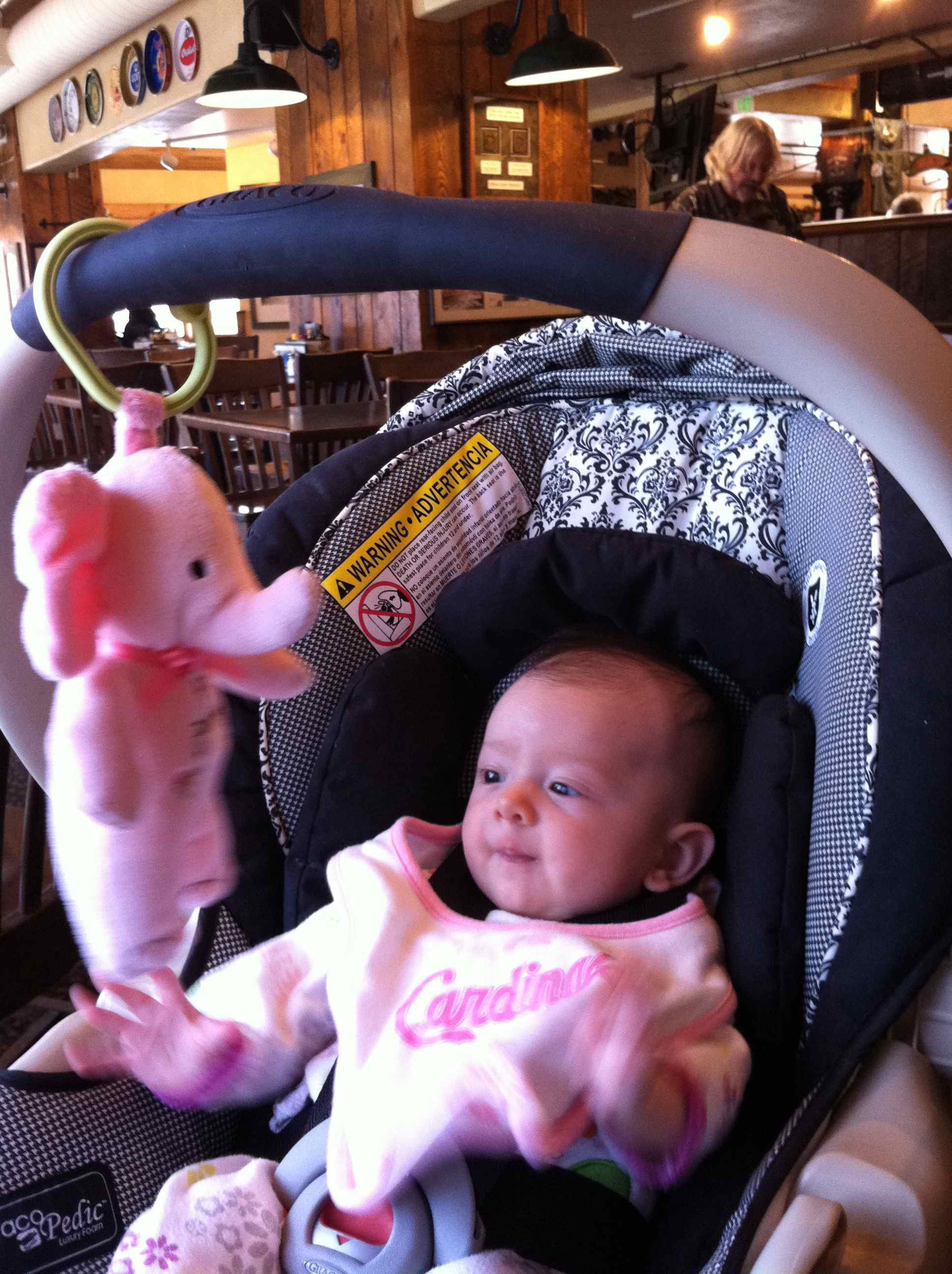 Also during our stop your dad and I grabbed some lunch, and you had on your Cardinals bib. In honor of the beginning of the baseball season, and your cuteness in the bib, I texted the picture to your grandpa Stephans, Uncle Denny, and Katy – all huge Cardinals fans. They loved it!