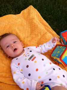 The weather’s been warming up, so we spent some time outside this afternoon. I brought out your blocks and we played with those a little, even balancing them on your belly. Then for awhile you were content just gazing up at the trees and the sky while I did a little yard work. When your coos stopped I looked over at you and you’d fallen asleep. It’s great that you seemed really comfortable outside and I’m excited to spend more and more time with you outside as the temperatures rise.