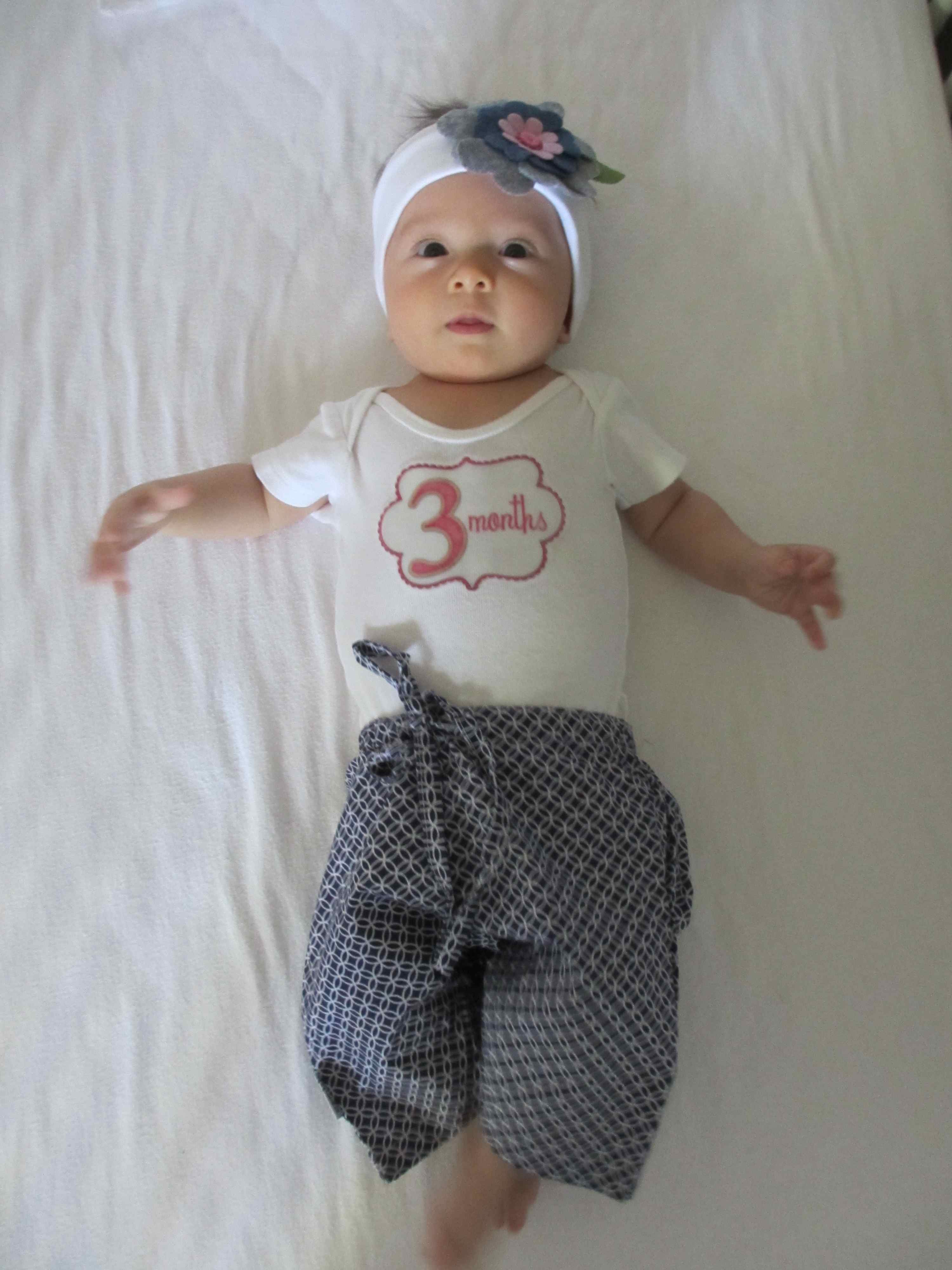 You’re three months old today! Your dad wished you happy three month birthday this morning while we were all snuggling in bed and it made me think of all the fun times we’ve already had and how much you’ve changed. Over this last month you’ve sure gotten bigger; you’ve finally outgrown every newborn outfit and you’re solidly into the 0-3 month clothes. You’re becoming more and more smiley and expressive, and you’re very aware of your surroundings, often content to just sit on my lap and look around. You’re also becoming a great sleeper, with eight hours or more a night becoming more and more common. We love you so much, sweet pea!
