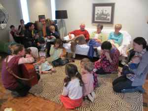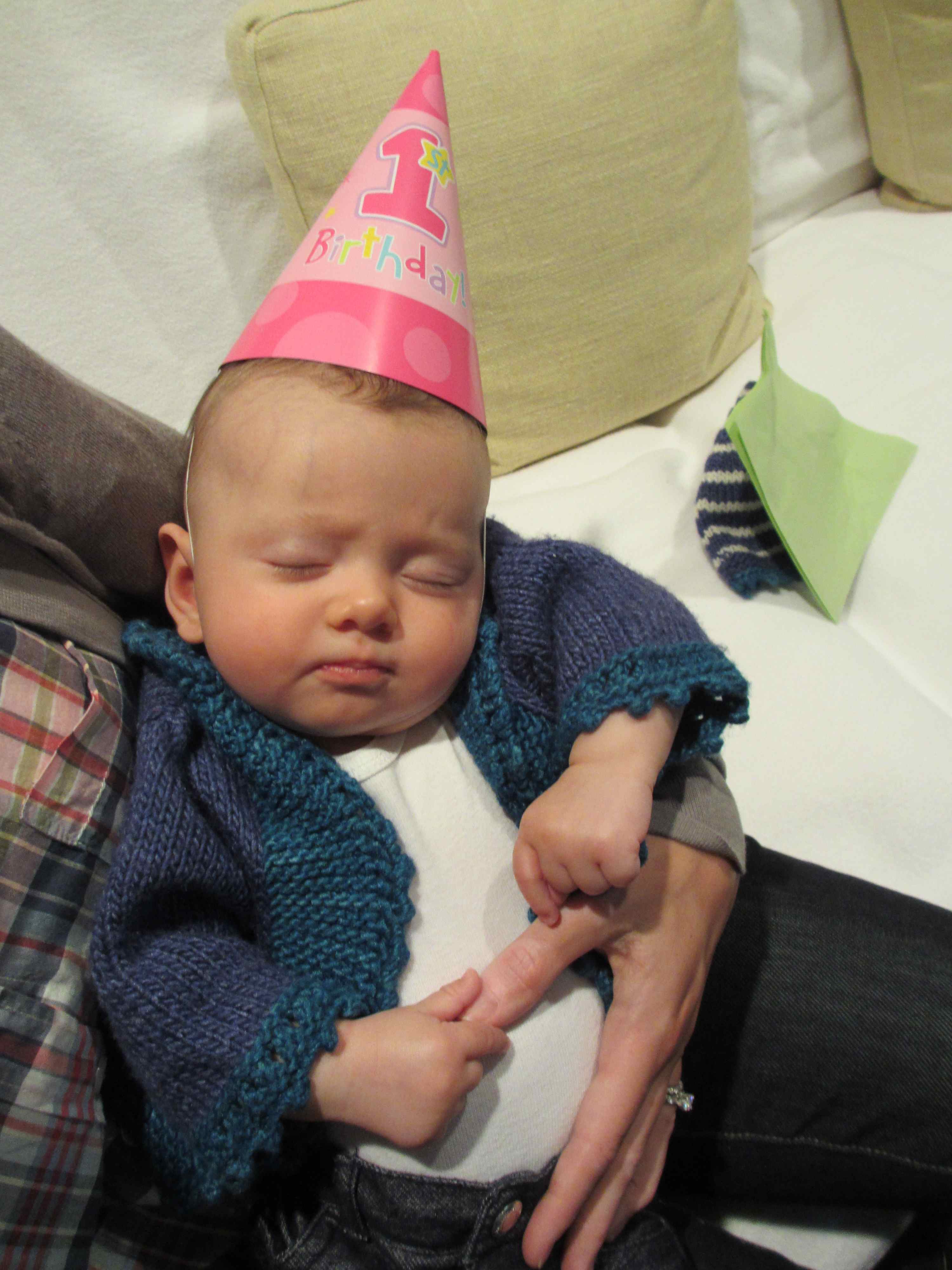 Today you attended your first birthday party – a party in honor of Eleanor’s first birthday. There were lots of older kids and two younger babies, and you seemed entranced by all the action. A music instructor came and sang songs while letting the kids bang on a drum, blow into duck whistles, and shake balls off a parachute. I was worried all the commotion would be too much for you, but you seemed really happy just observing everything. In fact, towards the end of the singing you fell asleep! I told your daddy we need to get that music teacher’s phone number so that we can go to her if we ever can’t get you to fall asleep.