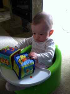 We were given a Bumbo chair – a hard, plastic chair that supports your back and legs so you can sit up easier. I tried it with you a few weeks ago and you weren’t quite ready for it, slumping down and wobbling all over the place. But this past week your dad pulled it out and stuck you in it, and you’re able to sit up and play. You seem to enjoy it!