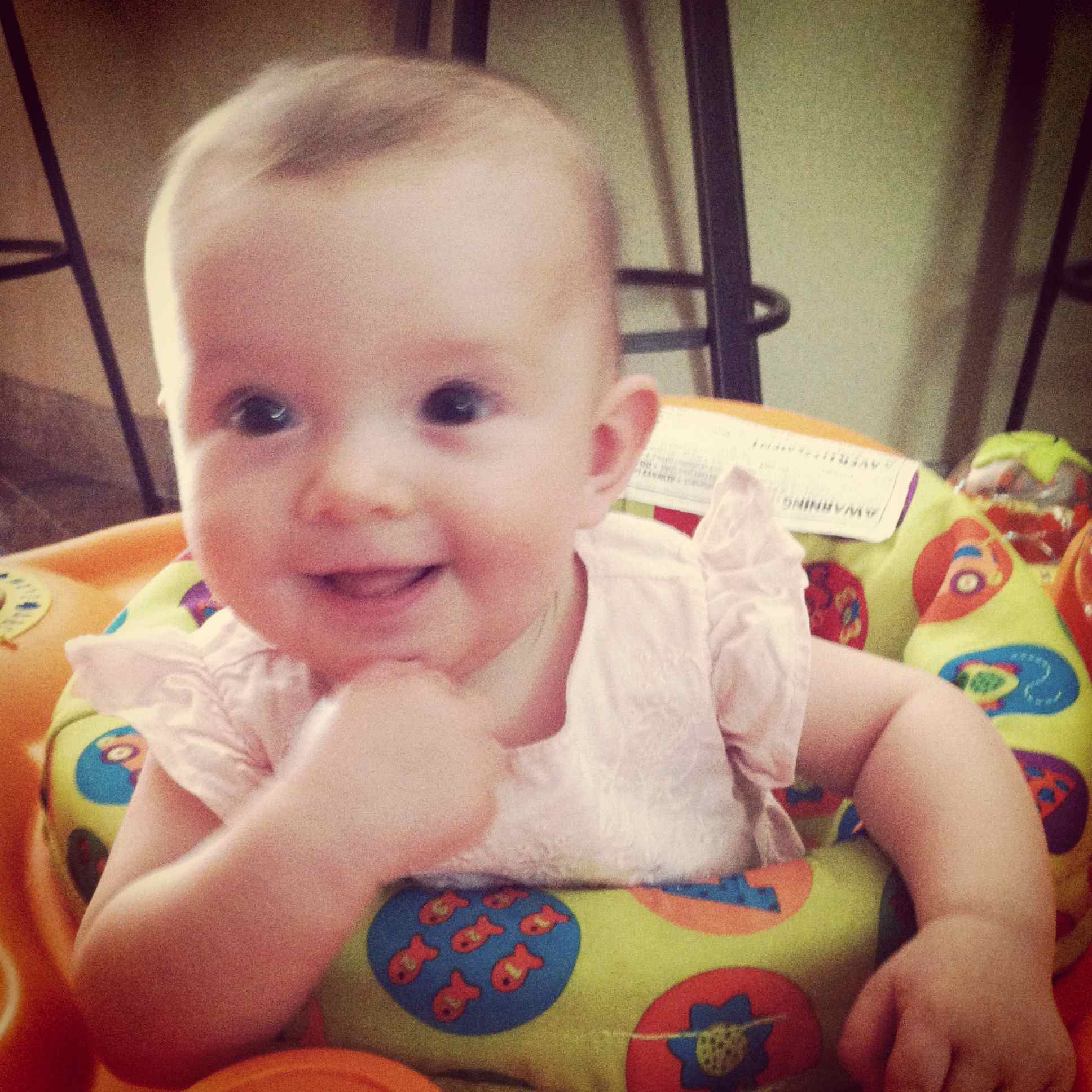 Anyway, today we’ve aimed to keep you up and so we’ll see how you do tonight. This morning you went to the Mapleton Rummage Sale with your nana and me. You were awake and interested in all the action for the first hour, then fell asleep. After the sale you were wide-awake so I thought we’d bust out your Exersaucer for the first time and see if you liked it. You loved it! I wasn’t sure if you had the head control and leg strength for it yet, but you really enjoyed it. You were content in there for probably 45 minutes!