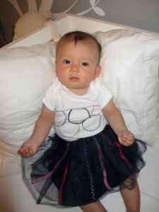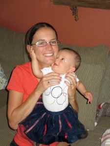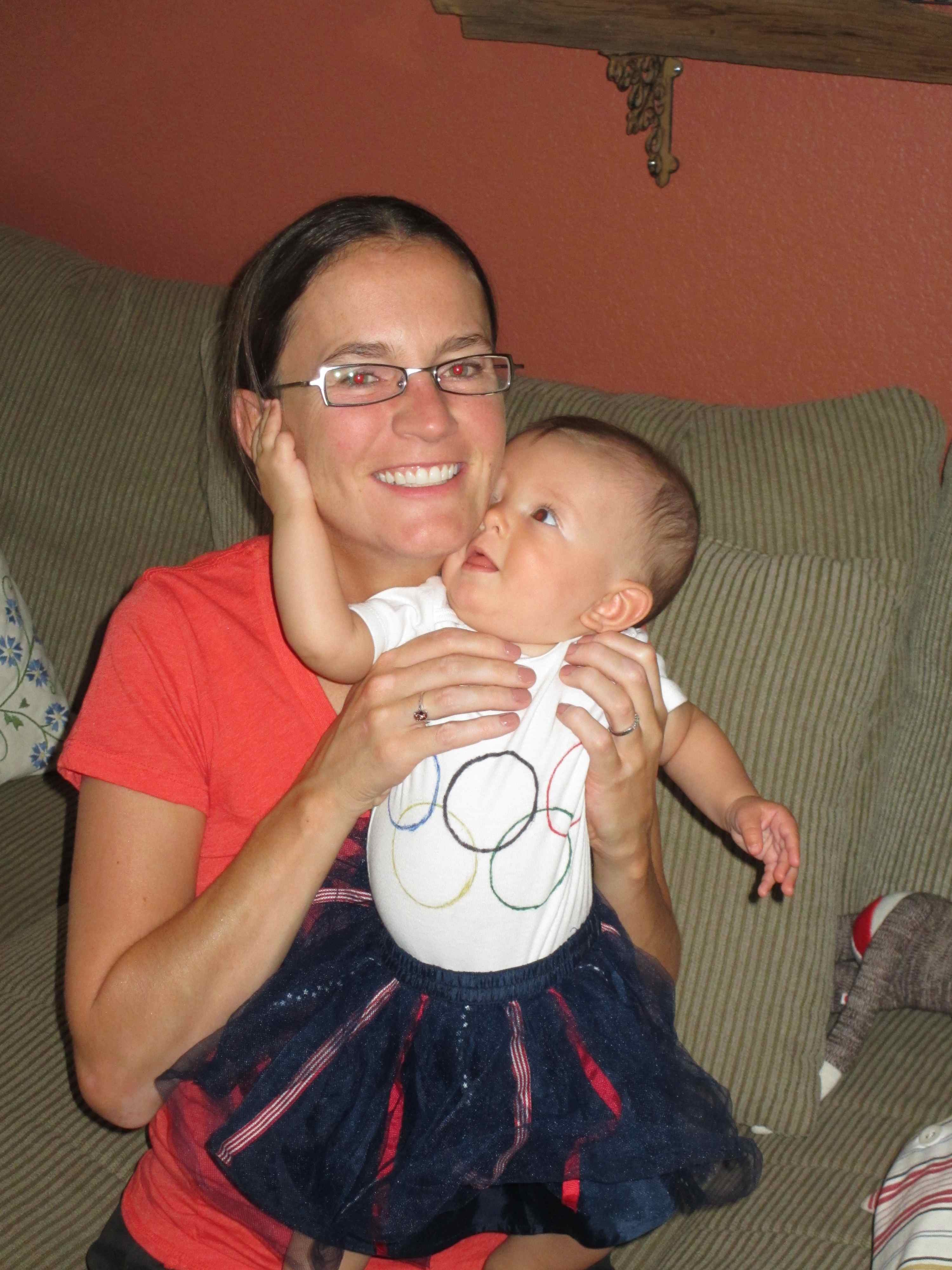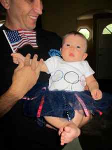 The Opening Ceremonies of the London Olympics were on TV tonight, and I was so excited. I made you an Olympic-themed onesie and you wore it and your USA tutu in honor of the occasion. I love the Olympics; the athletes are amazing and inspiring. This year I had so much fun wondering if you’ll enjoy watching them someday, if you’ll be an athlete yourself, and what sports you’ll participate in. While sharing my thoughts with your dad, he declared that you’ll probably be on the US national soccer team, and that you’ll play in the Olympics when you’re 20 and 24 (in 2032 and 2036). I was amused by his presumption, and asked why, if he was dreaming about this scenario, would you not play on the national team when you’re 16. He said that was a bit too aggressive. I’m glad to hear his dreams aren’t too optimistic.