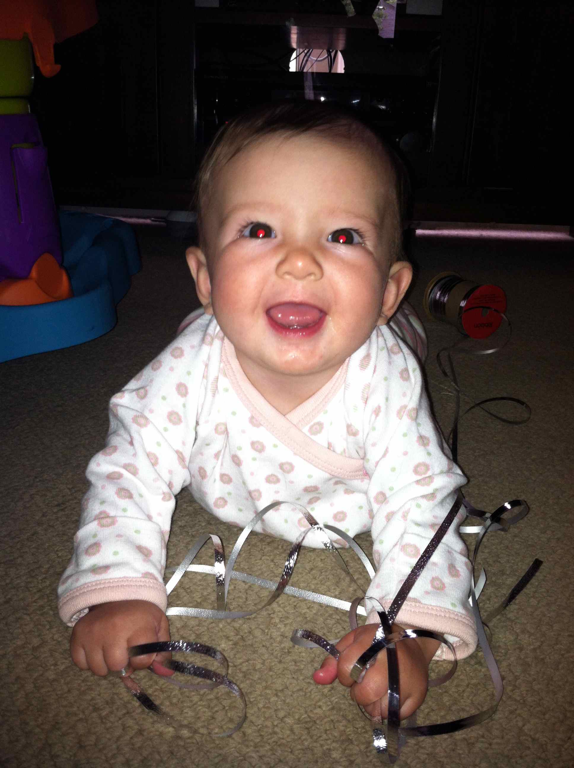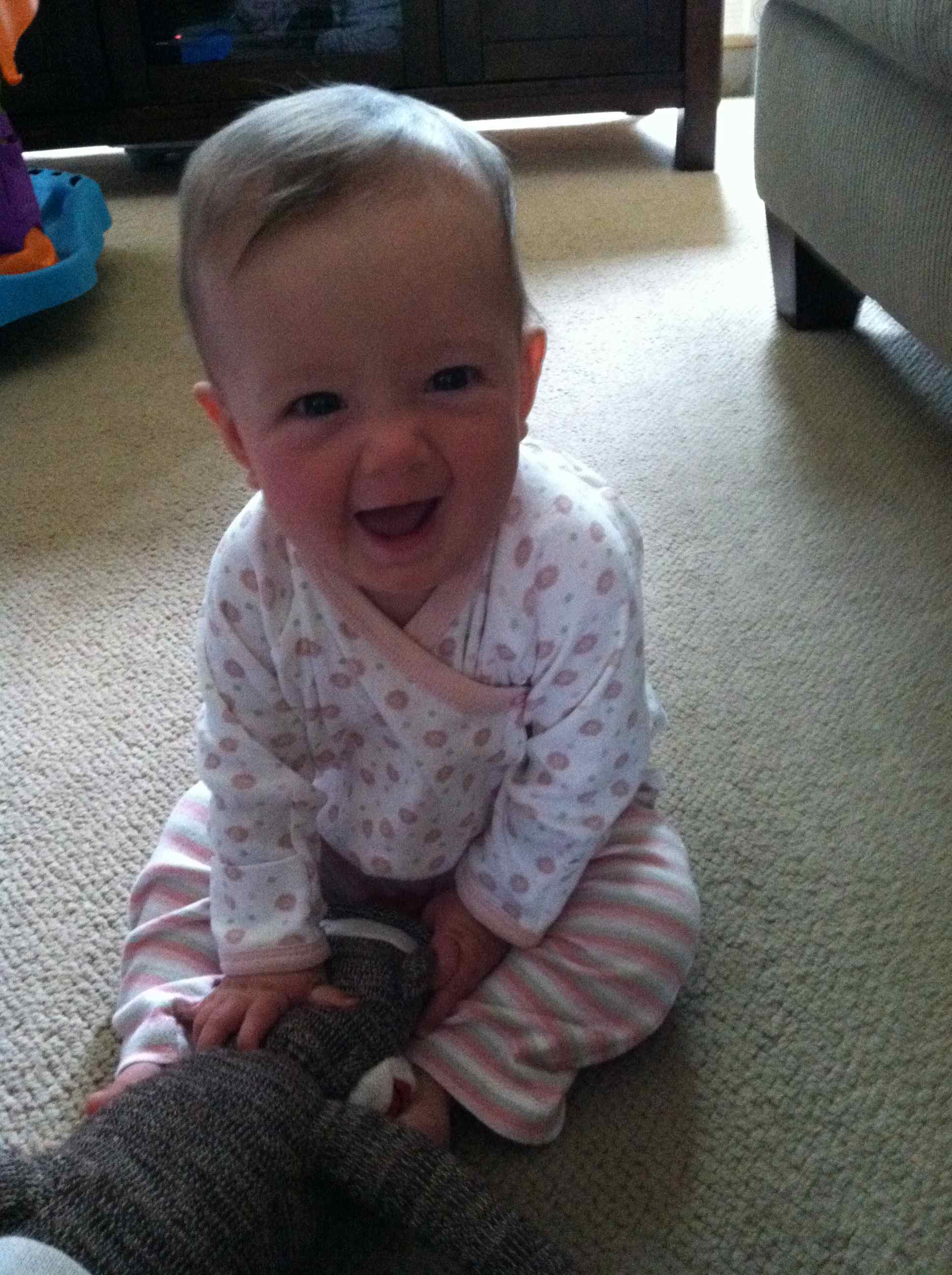 Today you really got more efficient at your little belly crawl, and you’re able to quickly cover a good amount of distance. I tried on a couple of occasions to take a video of you in motion, but I seemed to always start recording after you were a tired out. I’ve found that right after you awake from a nap and eat you are at your most active. I place you on your belly, you look all around you and hone in on something, and off you go. You pull yourself closer and closer, pausing to catch your breath, until you reach the object. Then you grab on, and roll to your back to examine it. This must be a tremendous workout for you, and you’ve been both eating and sleeping great since you’ve become so much more mobile. Your dad and I are having so much fun watching you, but also realizing we need to baby proof and be really vigilant whenever you are on the ground.