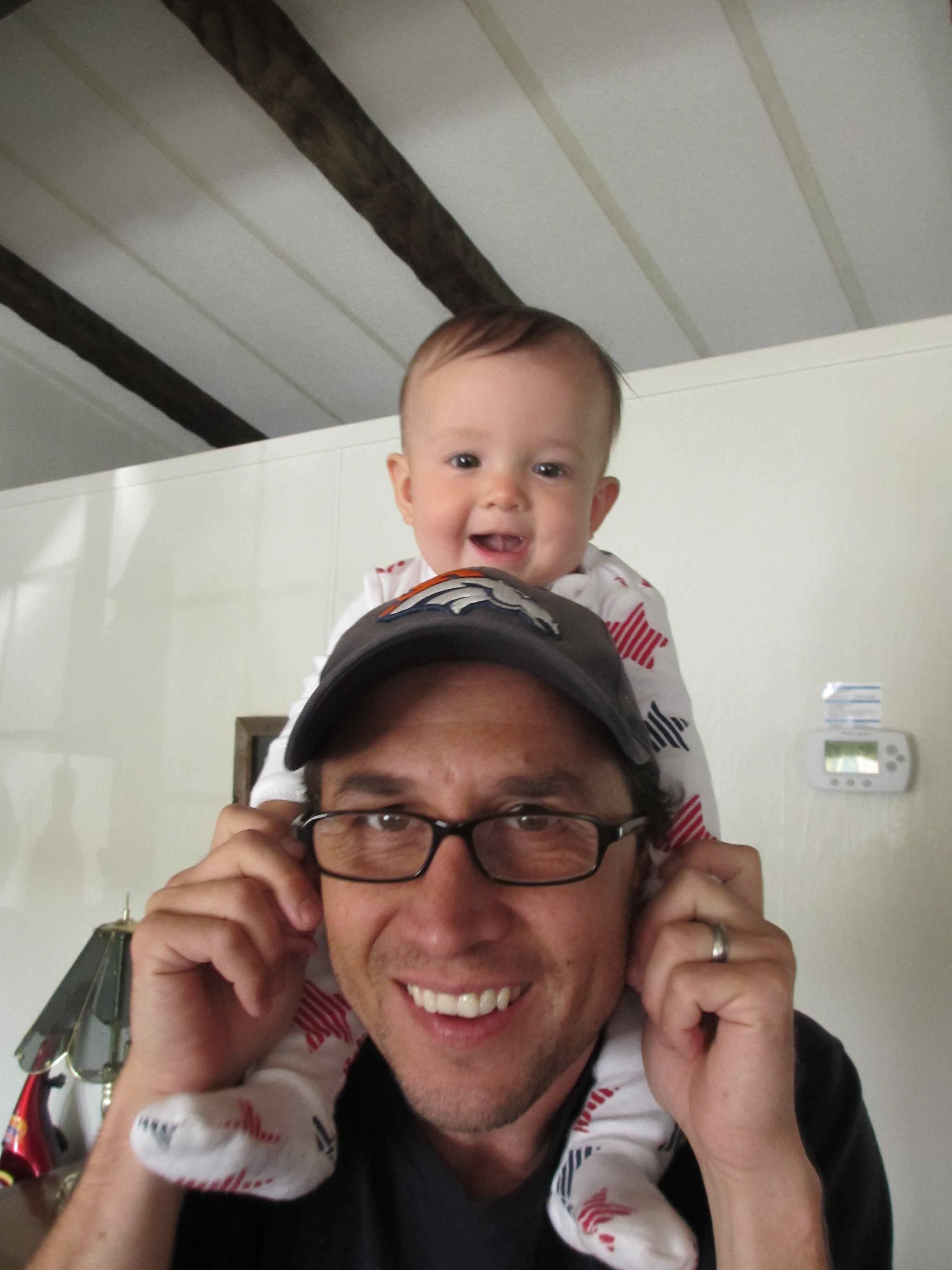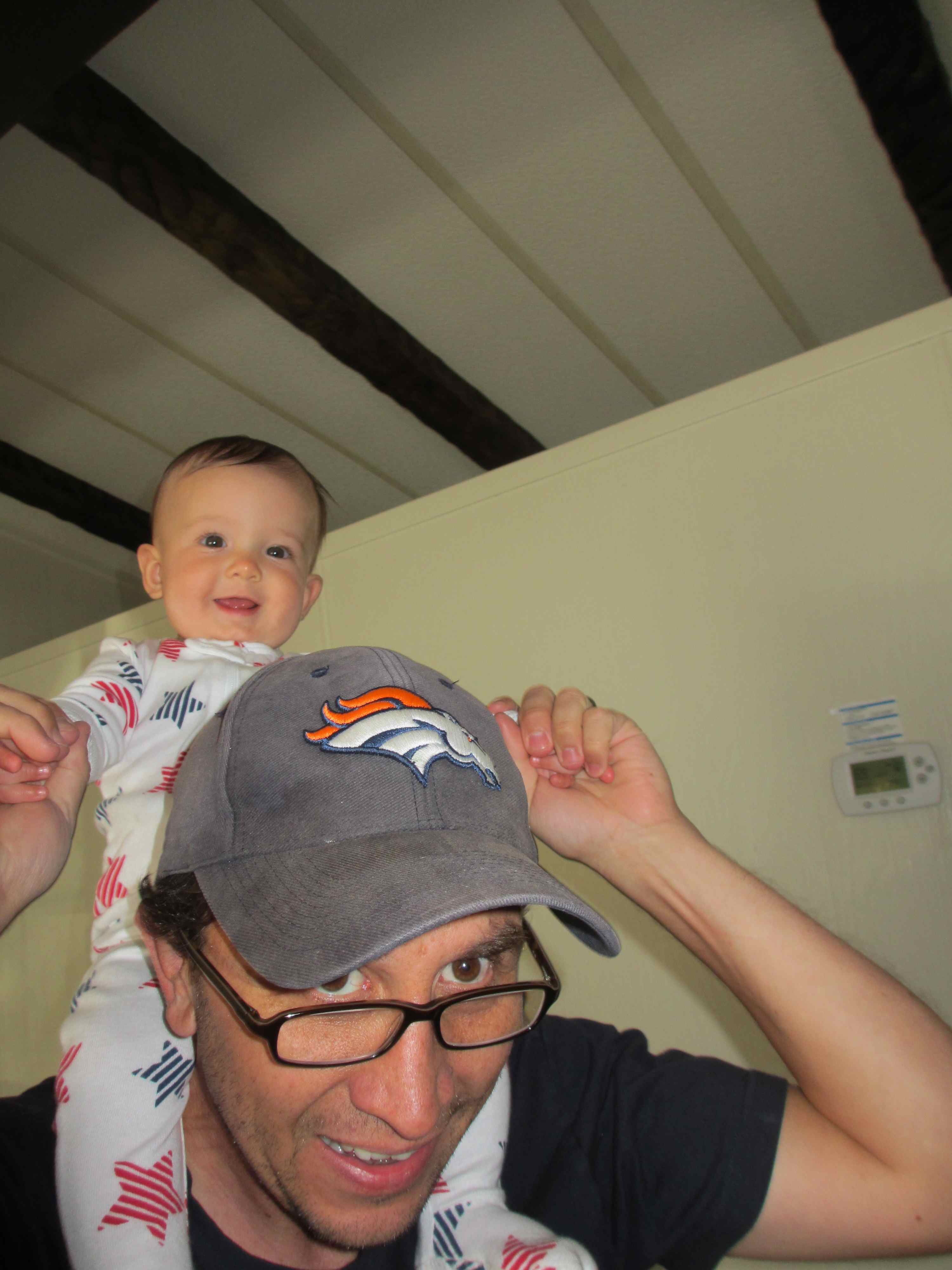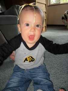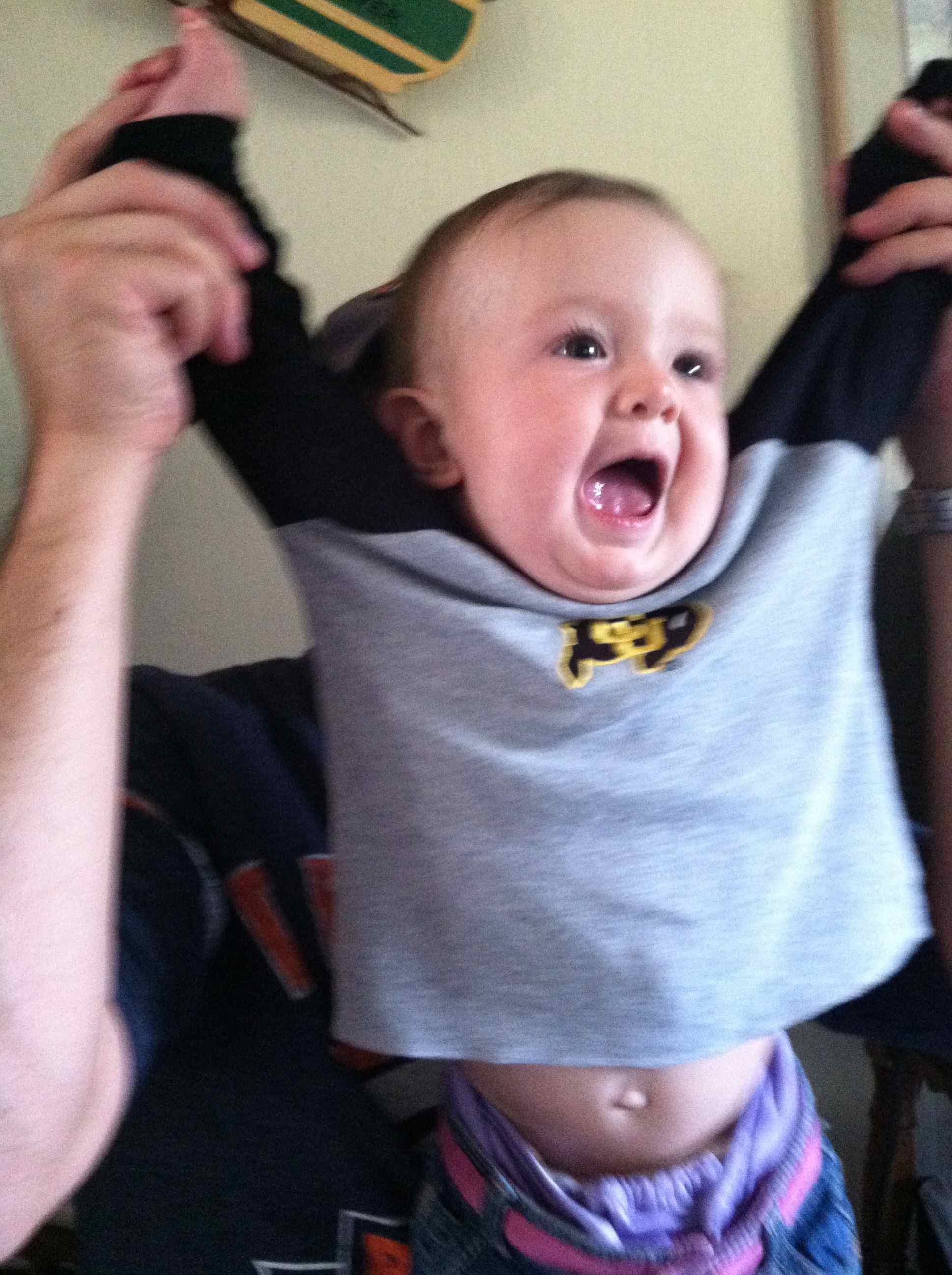 When we got home we watched the CU game. We’re really trying to keep you from watching TV, and so your papa found a good little space for you in the corner, between the couch and the chair. You’re contained back there, can’t see the TV, but still have a little room to move around. There is the handle for the reclining chair right there, and you enjoyed playing with it. You kept grabbing it and trying to get it in your mouth, and before we knew it, we looked and you had taken it off from the chair! We’re not sure what happened, but it caused us to proclaim that you’re going to be an engineer just like me. Also of note on this day: CU finally won a game.