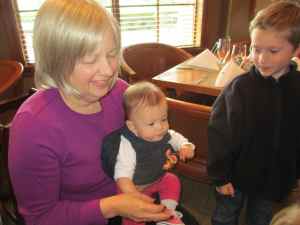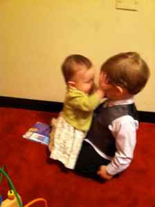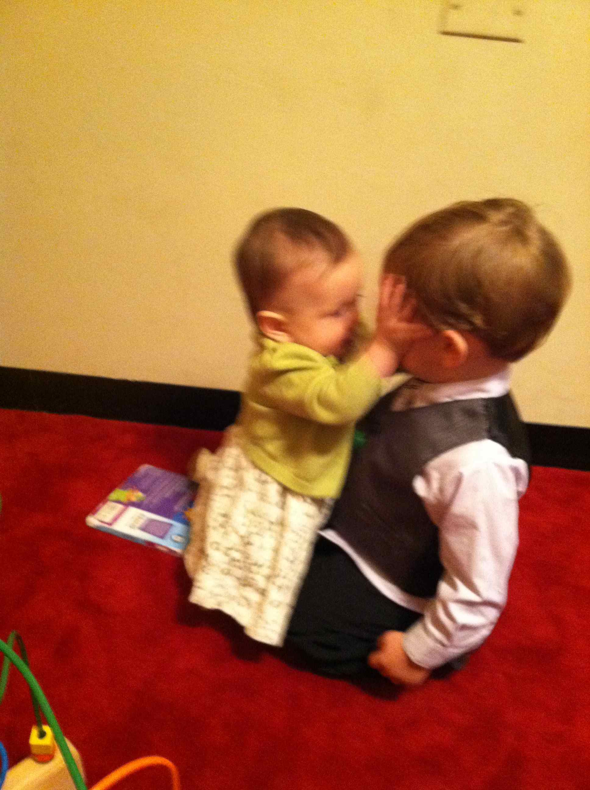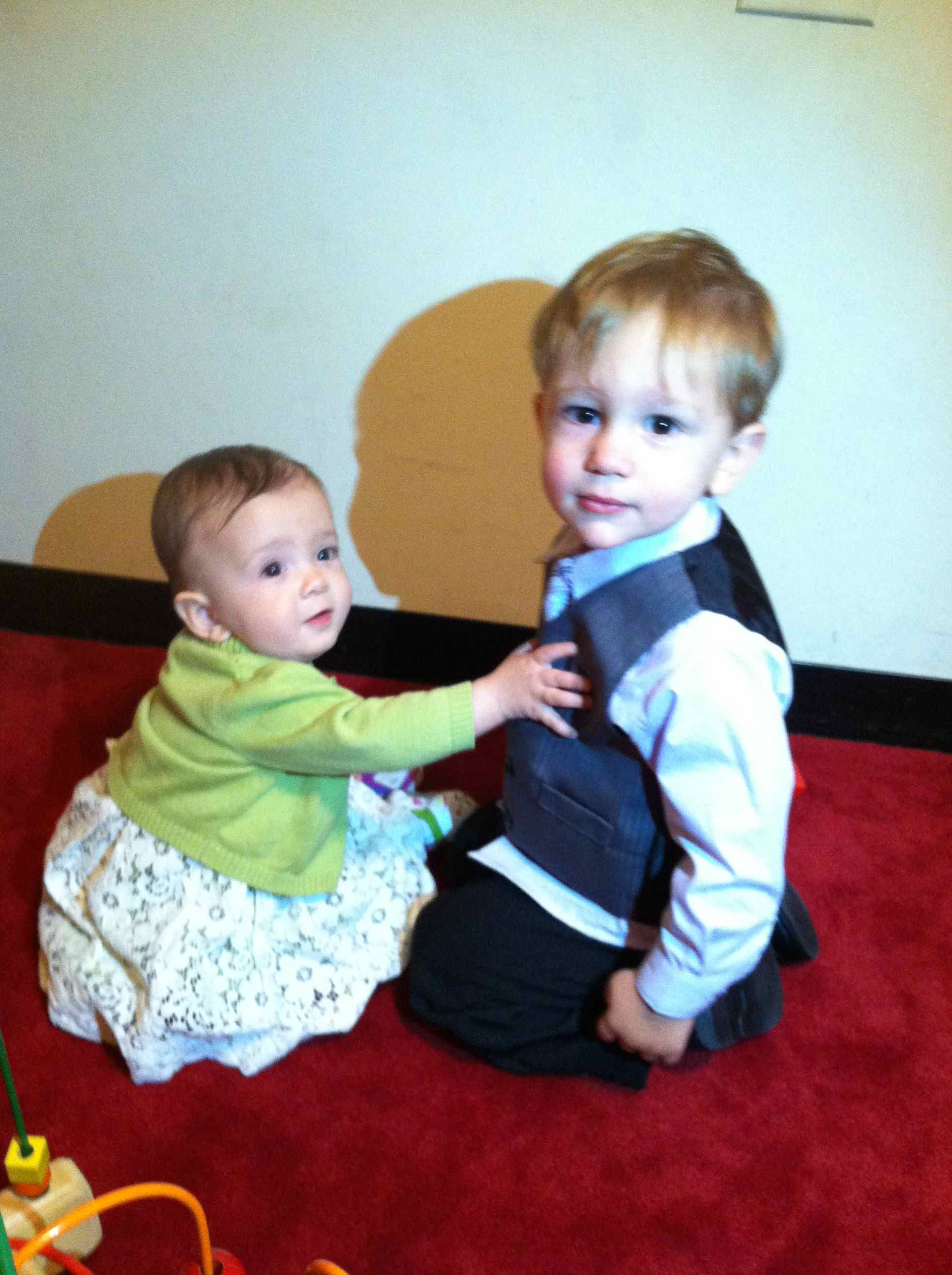 Before the ceremony started you were a bit fussy and you were very vocal, so both your grandma and your Aunt Gretchen nicely pointed out that there was a mother’s room in the back of the church where we could take you. Your dad took you there and Uncle Matt and Jackson were already there. It was perfect for you two; you were able to play and make all the noise you wanted. I didn’t get to see your interactions, but your dad said you two did great together. He was worried that Jackson would be too big to play well with you, or that the age difference would be too much and he’d be bored quickly. But he had what seemed like a virtually endless supply of patience with you, putting up with you pounding on him and poking at him, and at one point even tackling him. He just watched you and observed, never once getting upset. I guess one learns a lot of patience from having to constantly deal with two older siblings.