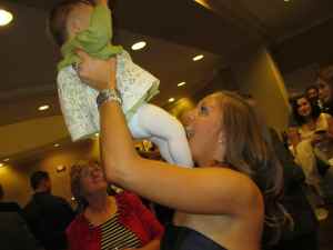 Next was the cocktail hour, and you continued to amaze me with your lack of trepidation in noisy, chaotic social settings. Numerous people stopped me because they wanted to meet you and visit with you, and you just took it all in. The party soon moved into the ballroom for the reception, and it was set up beautifully. I was so happy that they’d decided to do the cake cutting and speeches first; I knew I’d have to leave shortly to put you to bed and I was glad we didn’t miss these moments. My favorite speeches were Cousin Ali’s and Uncle Denny’s. They were funny and personal, and of course they both made me cry. Denny talked about when Kim was a little girl, and she liked to pretend that she was a princess. She’d pretend that her dad was her prince, and they lived in this blissful fairytale land. He talked about how now Brandon is Kim’s prince, and his words made me think forward to a day when someday your daddy will be giving a similar speech after giving your hand away in marriage. And of course this thought brought tears to my eyes.