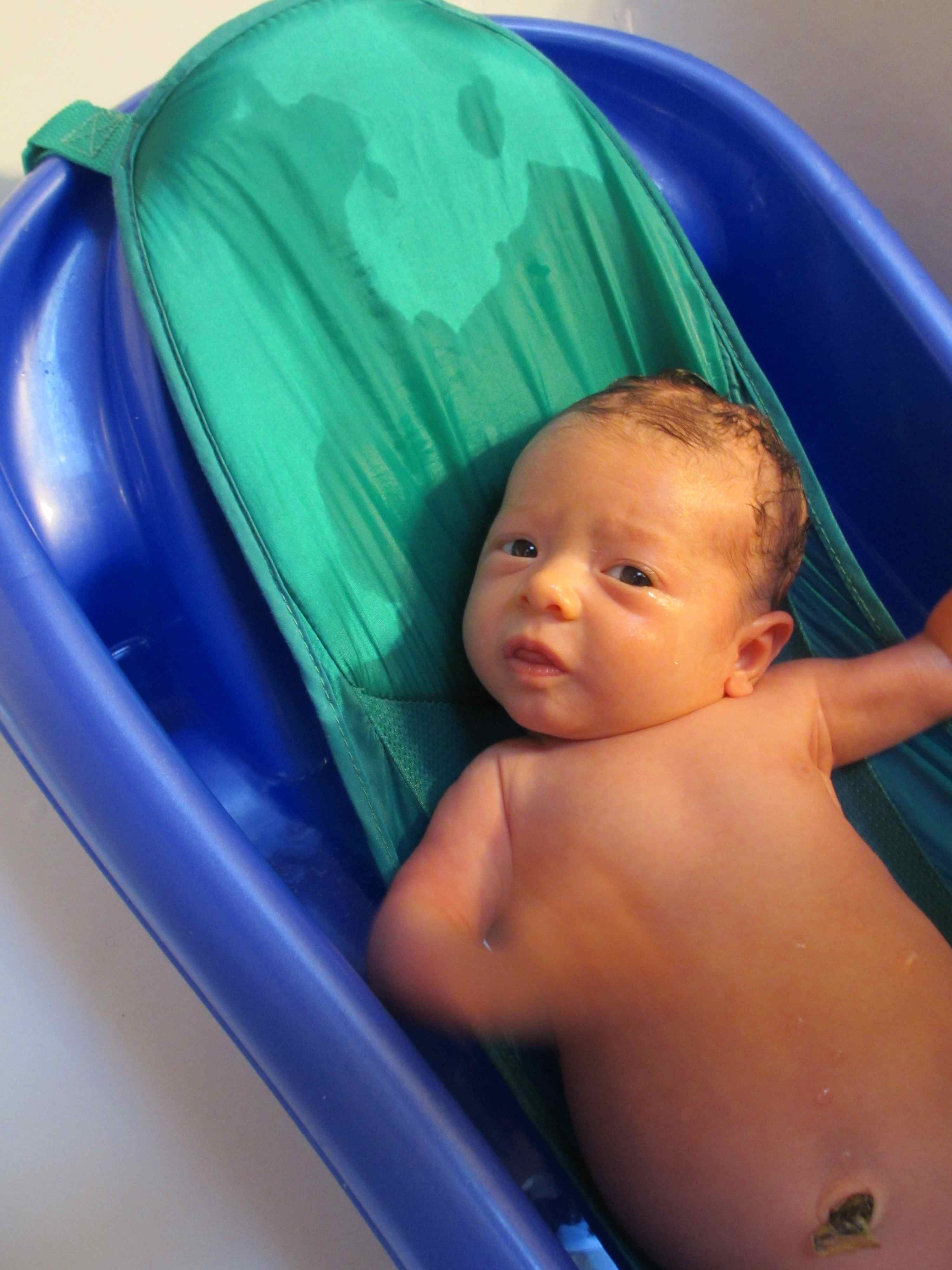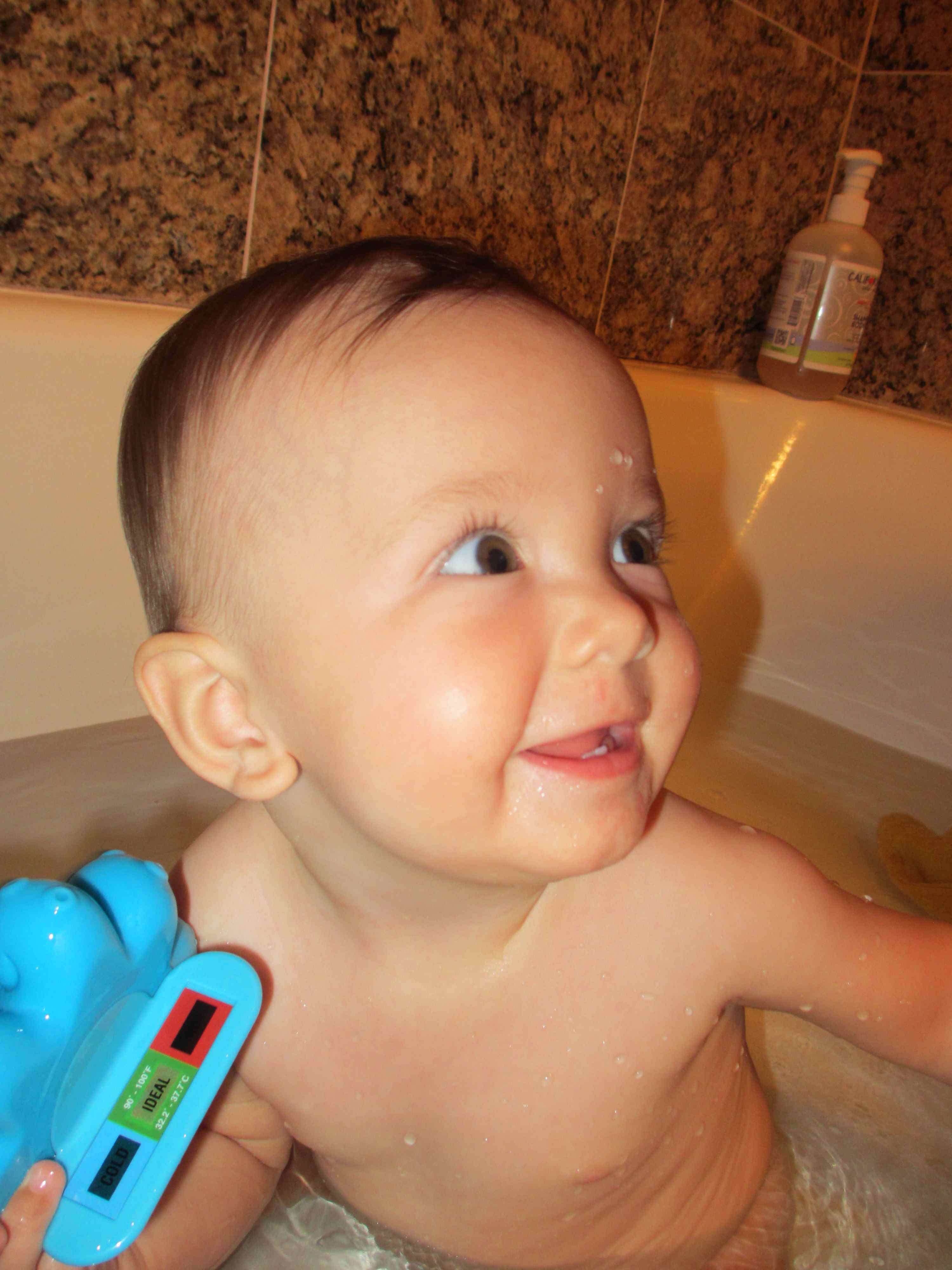 A couple of weeks ago the doctor suggested that we could utilize a laundry basket for baths. She said that when placed in the tub, the water can flow in and out, and it’d provide you with a contained space but still enable you to have some room to move around. We tried this twice. It was not a great success. You are so mobile and antsy and curious, and it is just so slippery, that it was just a stressful mess of you lunging for the sides and trying to pull yourself up and us constantly having to keep our hands on you to attempt to wrangle you back to a sitting position.