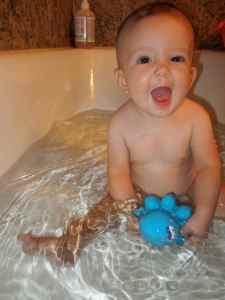 So we decided to just buy a bath mat and sit you up in the entire tub. The bath mat helped immensely with limiting the slippery factor, though you still spend a lot of the bath time trying to move yourself to the edge of the tub and stand up. Bathing you is an adventure and an exercise in constant vigilance. I know that in all instances we must be super vigilant while you’re in the tub, and we always are, but this is a whole other level of supervision which includes us constantly hovering over you with our hands always at the ready to catch you when you try to stand. I know many people include baths as part of the daily bedtime routines for their children. There is just absolutely no way we can do this. It is so chaotic and stressful, such a production. Right now we do it a couple of times a week, and that is plenty for us!
