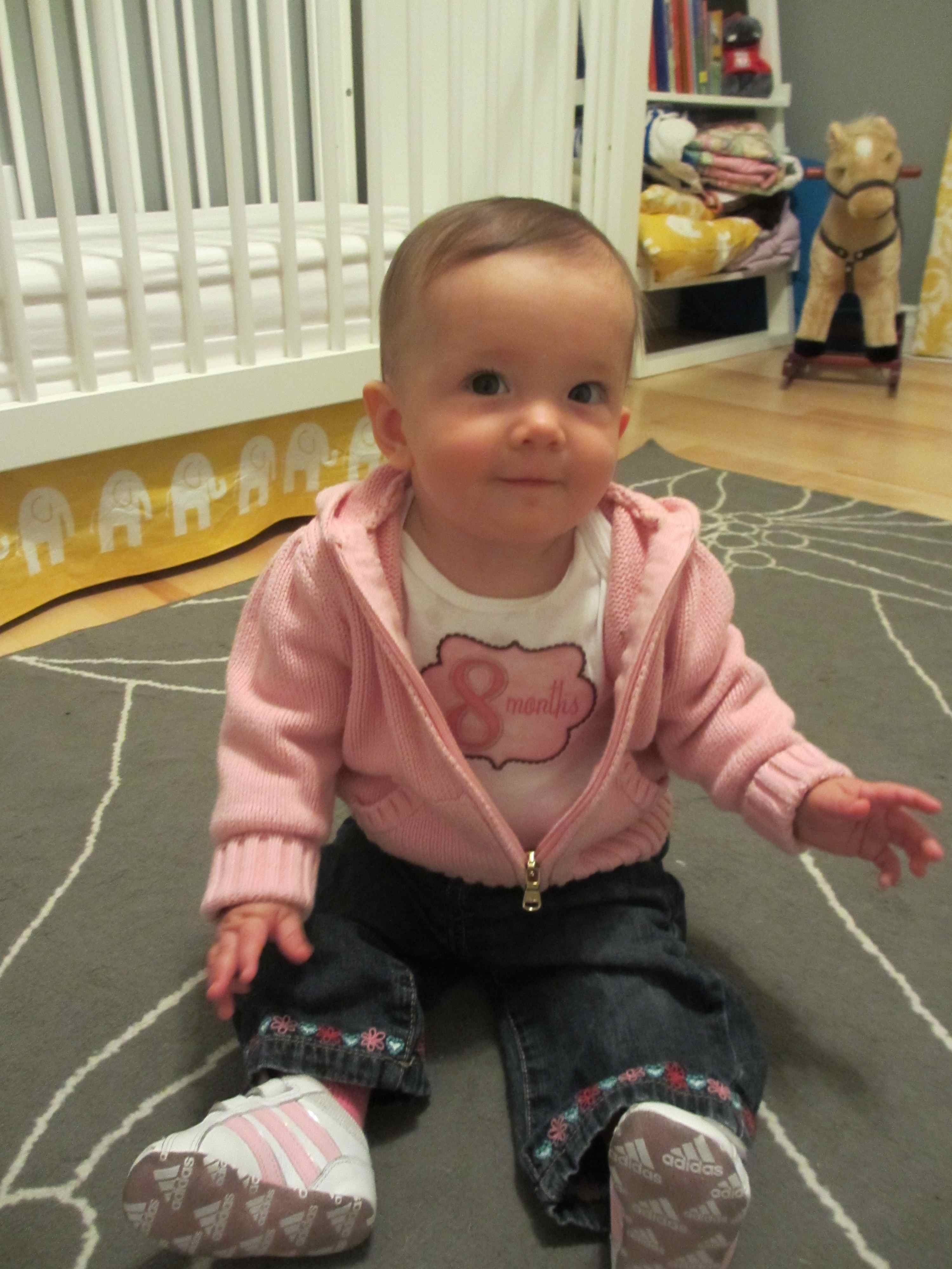You are three quarters of a year old today. You are as active and happy as ever. You still prefer to army crawl your way around, but you have really picked up the pace and make great time getting wherever you want to go. You enjoy exploring the house, opening cabinets and drawers, crawling under things, and playing with doors (moving them back and forth). You’re working on standing. You are still a really good sleeper at night, a great eater and an open-minded consumer of new foods. You smile big when you see yourself in the mirror, when you see someone you love, or when we make you happy by doing something silly. When you are most happy you wiggle your arms and shake them like you just can’t contain the excitement, and you sometimes also shriek with joy. We are having so much fun with you, and we really do do anything in our power to solicit a smile or giggle.