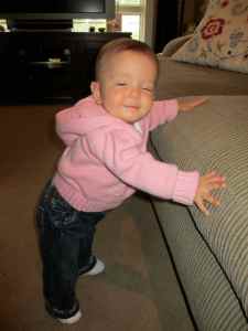 You are getting so active that your monthly birthday pictures are getting harder and harder to capture. I still try to lie you down in the crib to catalog the moment, but each month the pictures get blurrier and blurrier as you show off your ability to move. I tried to capture you standing, since this is your newest move, but it’s hard to get a picture because you don’t stay standing for long before you tumble over into our waiting hands.