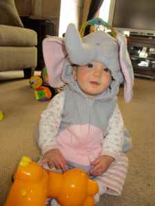 After a bit of time your dad and papa decided to get some yardwork done, and you joined nana and me on a shopping adventure. At the store we picked out an elephant Halloween costume for you. There were many cute costumes and it was hard to choose, but since we have an elephant theme going on in the room, and since you’d be able to wear the pink and white striped tights and pink shirt again, I figured the elephant would be the best. When we got home I put it on you, and you were adorable. For a few minutes you just sat there and kept pulling on the ears. One time you pulled so hard you knocked yourself over! You didn’t seem to pay any notice to the trunk. I was sure that was the part that would grab your attention, but you didn’t try to grab it once. After a bit the novelty of your new outfit wore off and you just resumed playing and crawling around. When you crawl the ears droop forward and the trunk hangs to the ground, and the little tail on the back pops up, and you look like the cutest little elephant around.