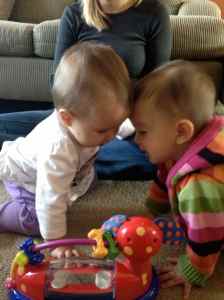 You are still as curious as always, perhaps even more so now that you can efficiently get yourself to almost anything you’d like to investigate. You’re very perceptive and notice when something is new or different. Your nana tied a string onto one of your toys to make the pull string longer, and every time you use that toy now you study the new string and the knot connecting it to the old one. Last night I pulled down the three supports on the bottom of the Exercauser to make it more stable, and you immediately crawled over to it and started pulling at and studying the supports.