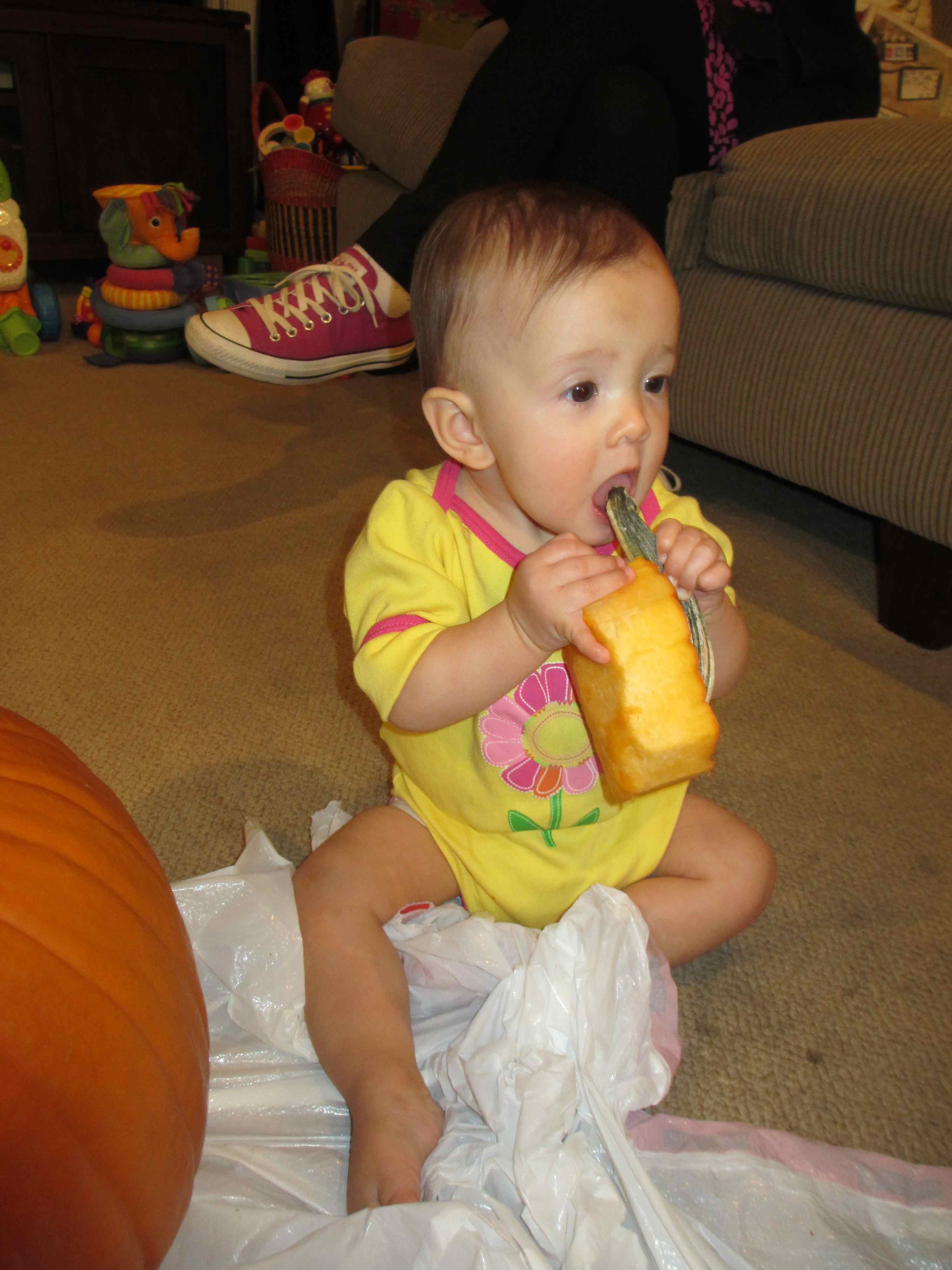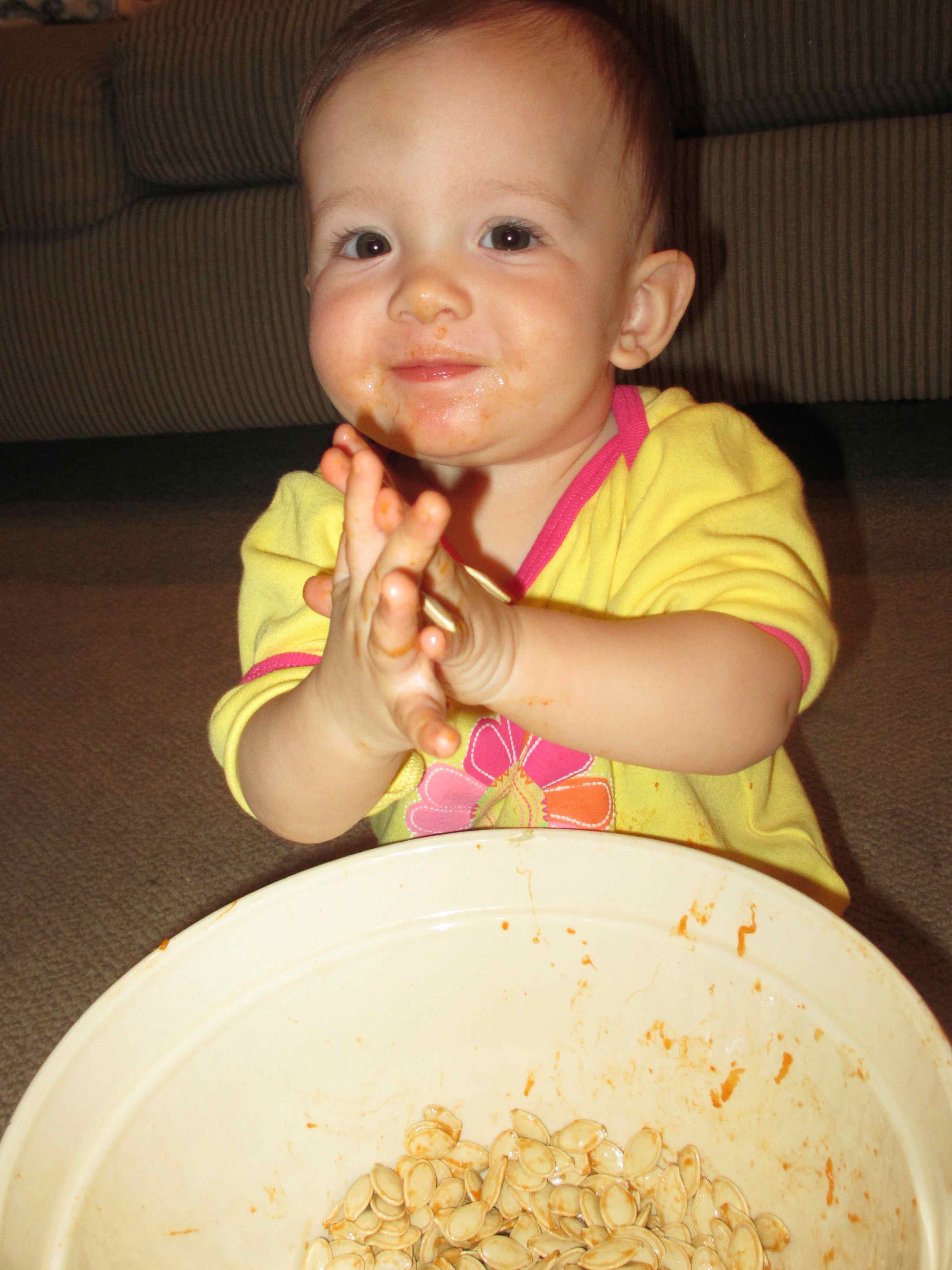This evening I decided that I wanted to get the seeds out of the pumpkins. We never did get them carved in time for Halloween, but I really wanted to at least bake the seeds. I thought it’d be a fun activity for you to help me with. I laid out plastic on the ground, your dad cut off the tops, and I sat you down with the two pumpkins and a couple of spoons. I thought you’d dive right in with your hands, but you were more intrigued by the pumpkin tops, and even tried multiple times to eat the spiky stem! After a little while you reached into the bowl containing the seeds, touched them, immediately pulled your hands away and with wide eyes, just stared at them in surprise at their cold sticky texture. After a few seconds you dove back in with much less trepidation, and continued to play and try to eat them for awhile.