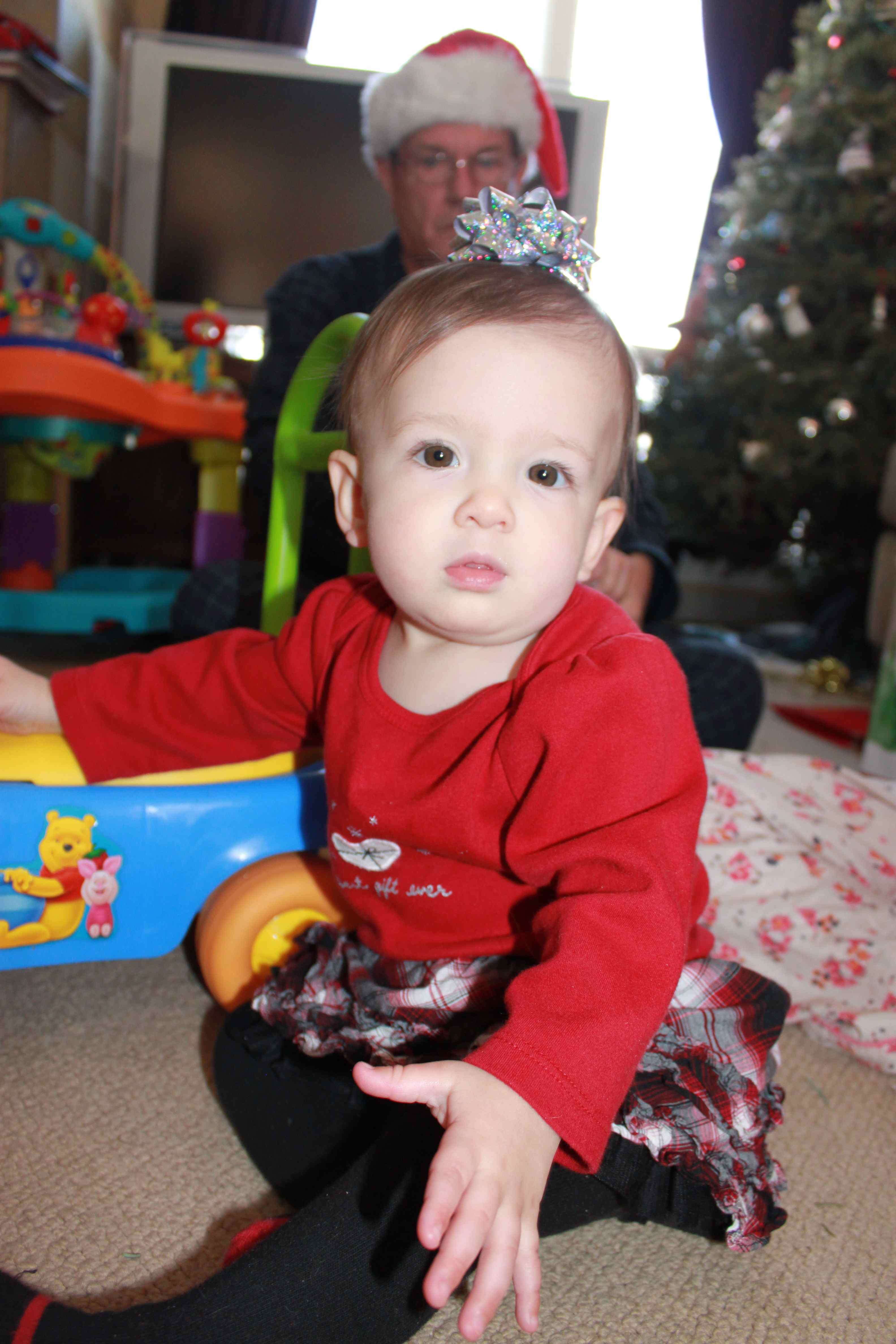Nana and papa stayed here last night, and we all woke up and almost immediately dove into present opening. First was your stocking. Even with lots of prodding you didn’t really understand that you were to pull out the objects from within the sock, and that they were for you. After that we started opening gifts. We’d start opening the present for you by making a small rip in the wrapping paper, and you’d take it from there. You’d rip and tear until you’d freed a piece, then more often than not you’d try to eat the paper. Papa kept telling you that you can’t eat the paper and taking it from you. Towards the end of the presents you were a pro; you’d rip off the paper and immediately hand each piece to papa!