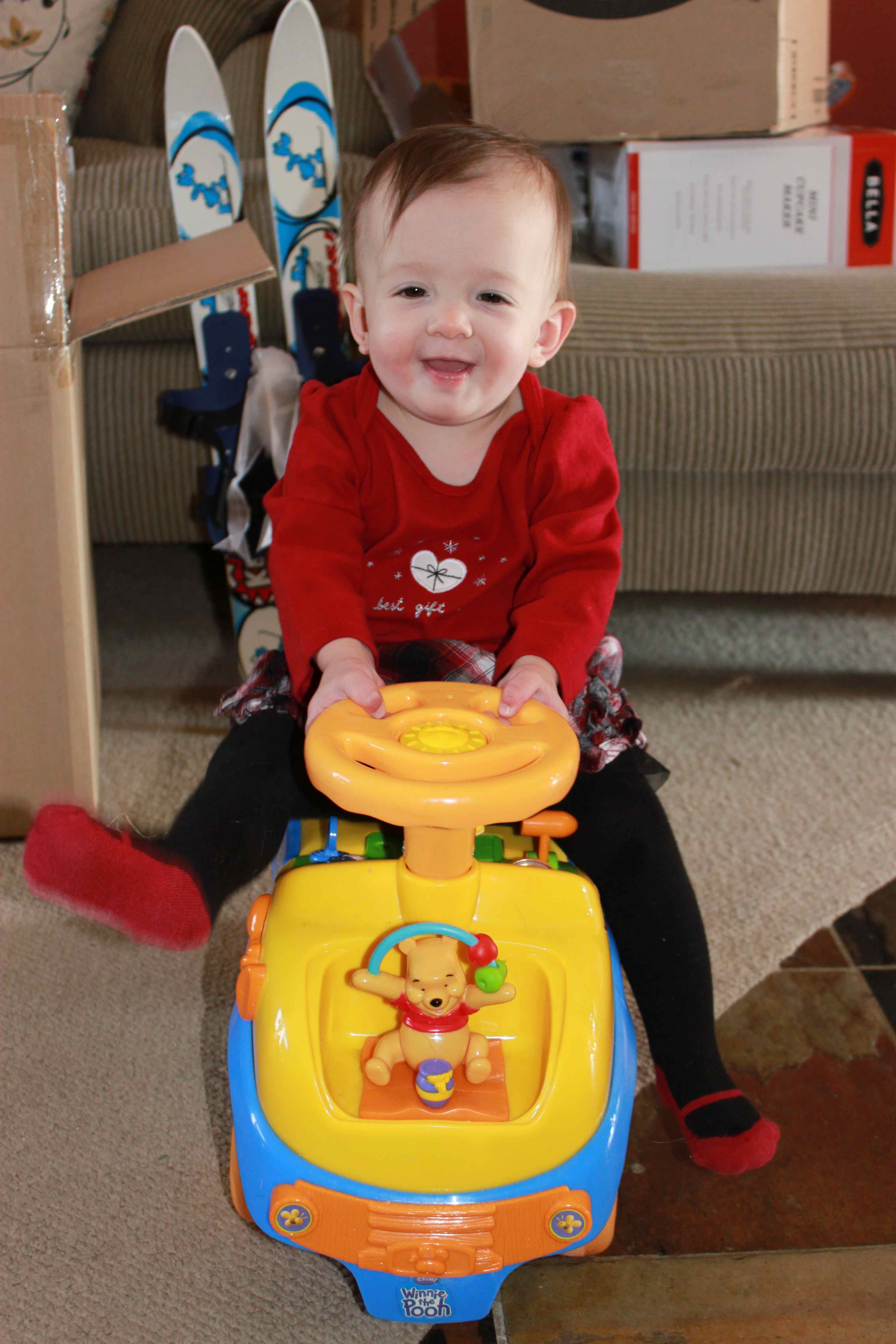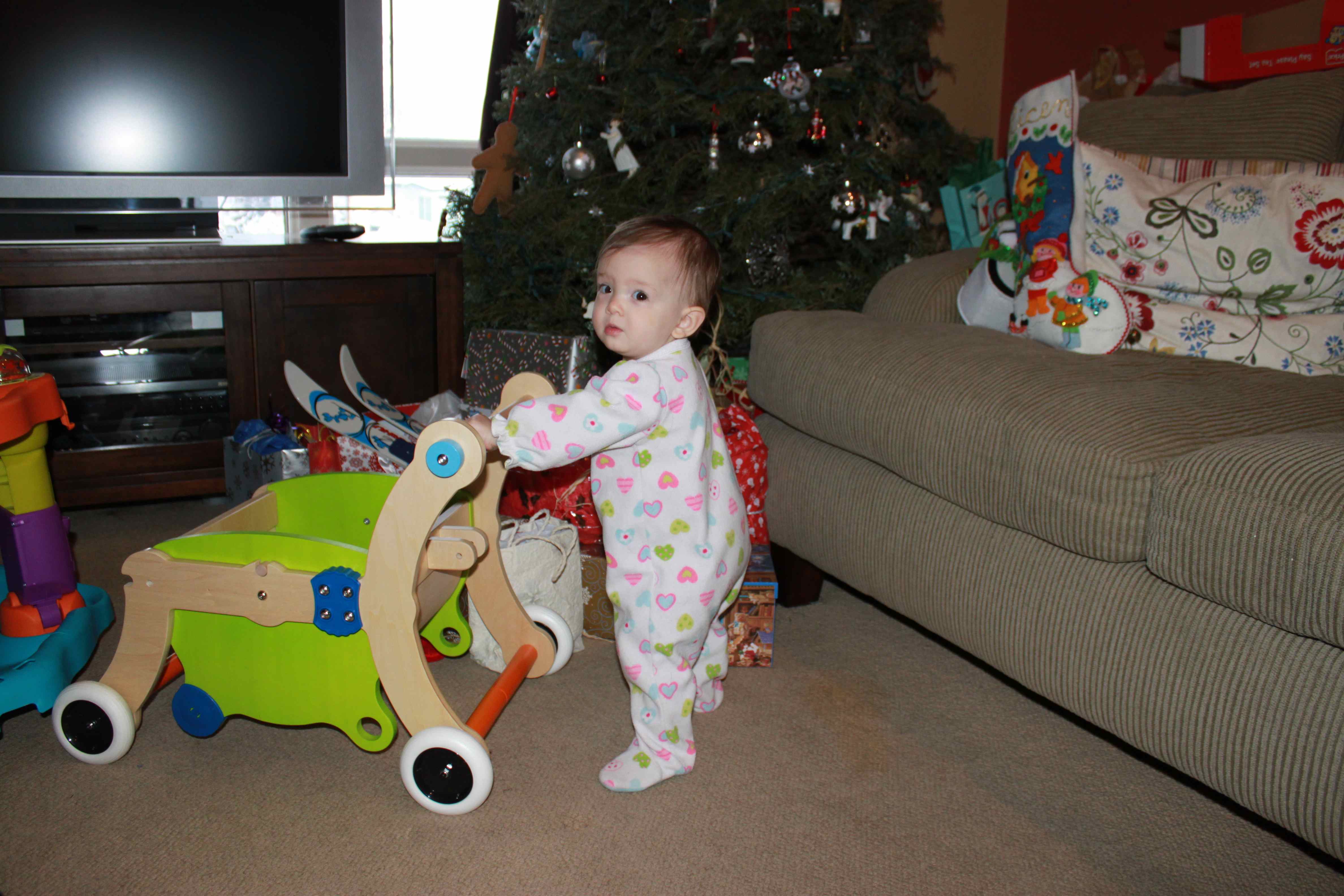 Some of your favorite presents included: a Winnie-the-Pooh car just like the one you enjoyed at your cousin’s house in Seattle (from Grandma and Grandpa Stephans); your first pair of skis (thanks to nana and papa); a walker (from Denny and Nancy); nesting cups and a shape sorter that will be perfect on the beach in Costa Rica (though also perfect here; thanks Jen and Brett); and a little toy house that makes all sorts of sounds and music (thanks Kim and Brandon).