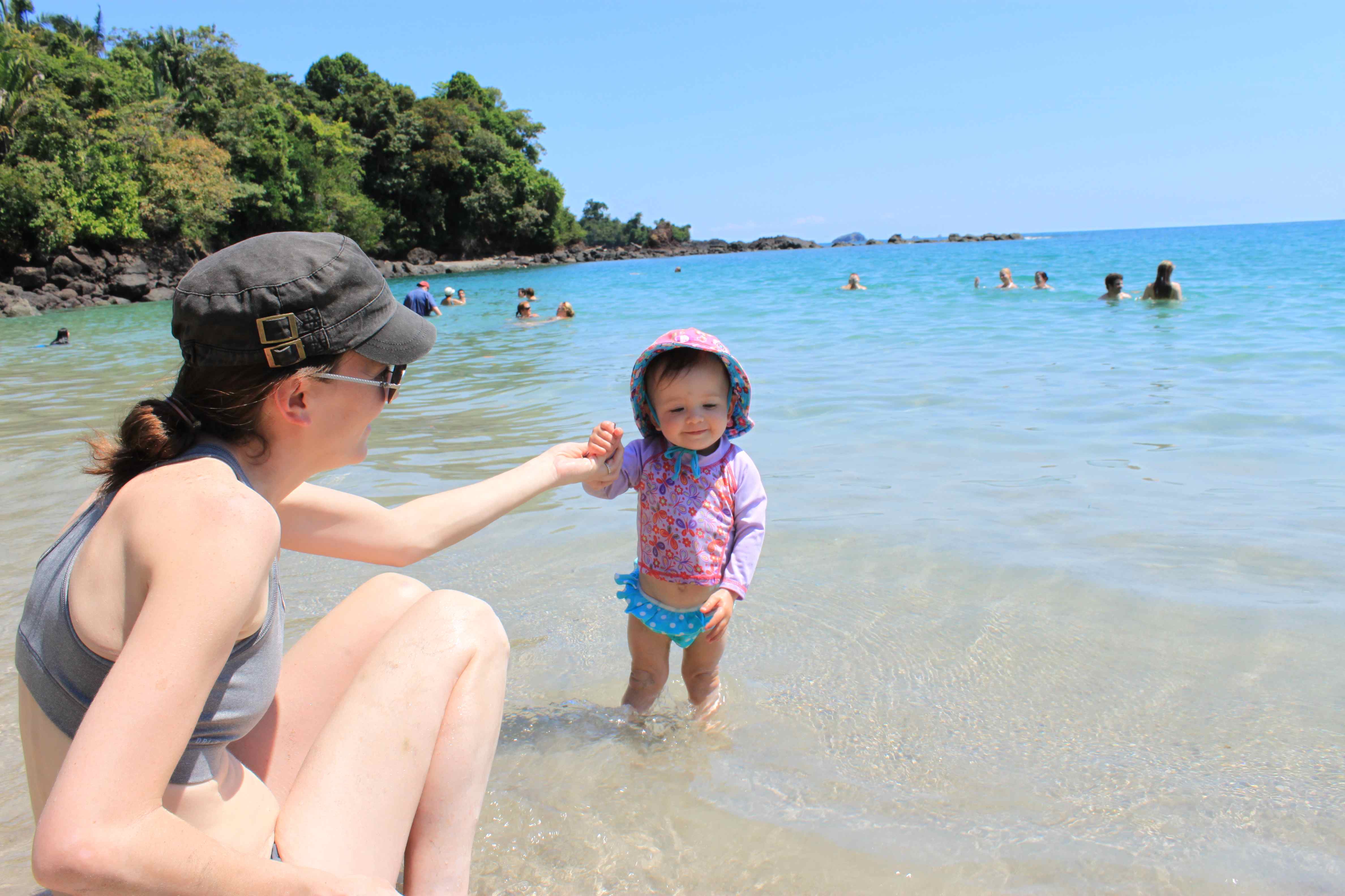 But the hike kept progressing at a glacial pace and you were just over it. We’d seen a few sloths (which are my favorite and which were all I really cared about seeing) and your dad and I remembered from last time that we were nearing the end. So we said thank you to the guide and left the group to head to the beach. You and I changed into our bathing suits and headed to the ocean. Your dad stayed behind to watch our stuff and take pictures. I carried you to the edge of the water and put you down. You stayed standing and just watched the little waves come in, and when one finally reached us, you giggled as it passed over our feet. It was a picture-perfect reaction (wish we had it on video). You just stood there happily for a few minutes watching and feeling the waves come and go and the sand slowly bury your feet. I can’t imagine what an experience it must have been for you to experience all of that for the first time.