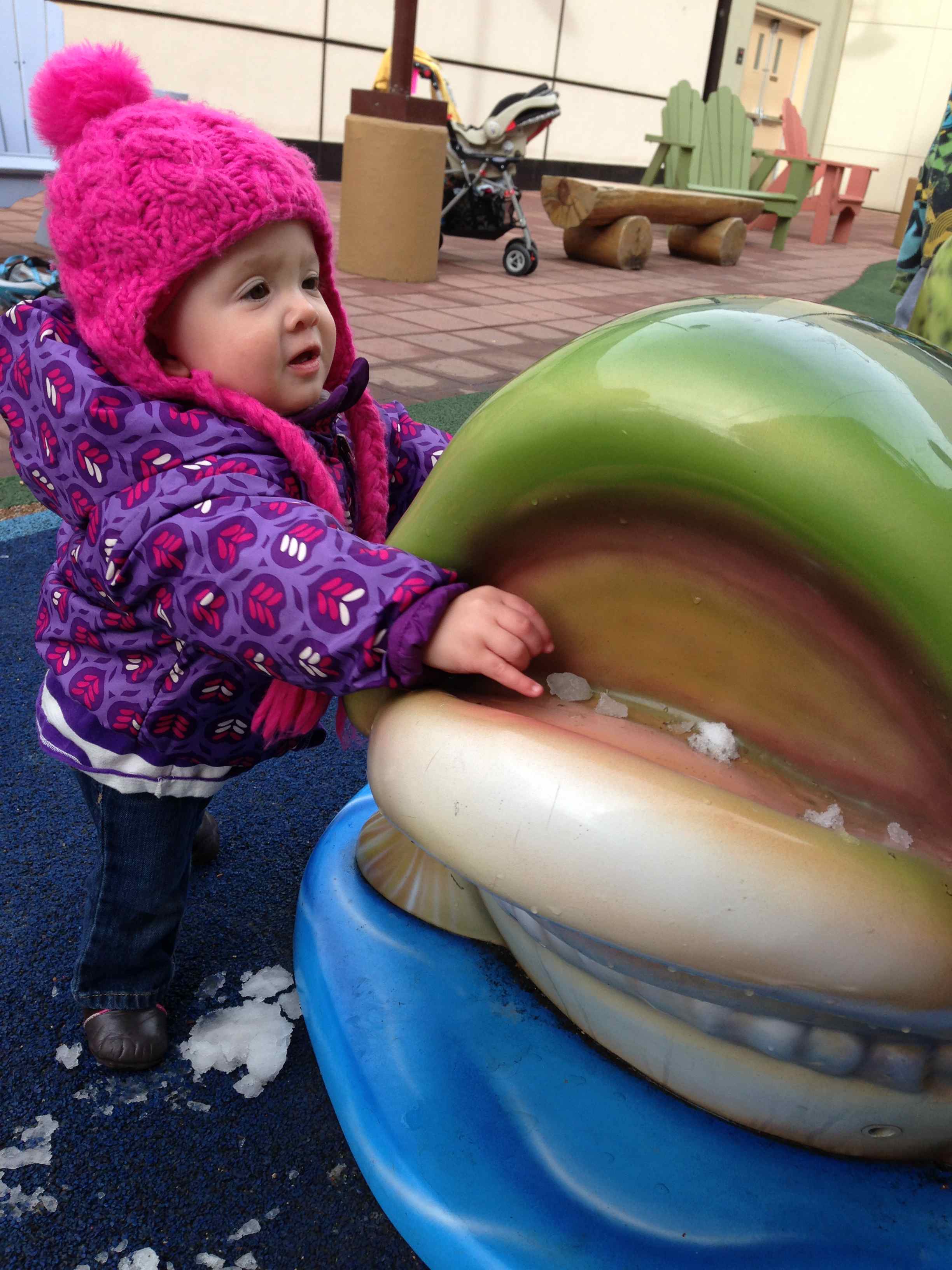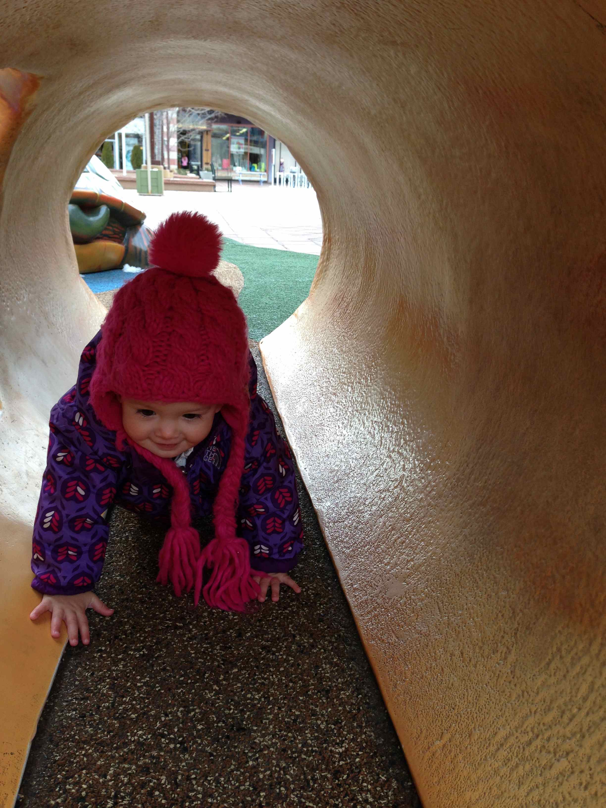 We headed to the play area and I sat you on the ground. There were six older kids running around and you were fascinated watching them for a bit. But then you started exploring. There was bits of snow in the shade of the play structures, and in the mouth of the large fish. You seemed perplexed by the snow, bending down and touching it and brushing it out of the fish’s mouth. There were two log tunnels that you crawled on through with minimal prompting. I leaned down at the far end and said your name, and as soon as you saw me you crawled toward me. I’ve never seen you go through a tunnel so I was surprised by your lack of hesitation. You happily played and explored for about thirty minutes, then we had to go pick your dad up from work and head to Breckenridge. But I sure am excited to have a fun outlet for you to play in the midst of one of my favorite shopping locales!