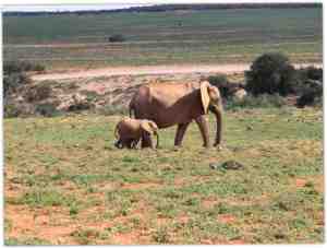 We spent Thursday through Saturday at Addo Elephant National Park. We were so excited for our first safari experience. We drove in our own vehicle on Thursday afternoon, and quickly saw kudus and elands – different types of antelope – as well as ostrich and wombats. We were at a lookout on top of a hill when we spotted our first elephant, a huge brown spot moving through the thick brush below. We quickly drove down, trying to watch him as he crossed the road below, but we didn’t intercept him. We drove a few more km and turned into a grassland clearing, where we spotted more than 30 elephants. It was amazing. We pulled over and watched them drink and play at a water hole. The next thing we knew, they were walking towards us and crossing the road. One stopped about 10 feet from us and stared at us for awhile. Alicen was so scared and rolled up the window and exclaimed to Jeff that he was going to charge, but he just looked for a few minutes and then walked on by. We had so much fun watching them. They are Alicen’s favorite!