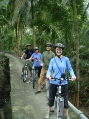 Our favorite part of the bike tour was after we took a short boat ride across the river to a peninsula just outside of the city. Here we were able to ride across a series of elevated paths. We had to have a steady hand and be careful around the corners so we did not fall in the mud and water below!
