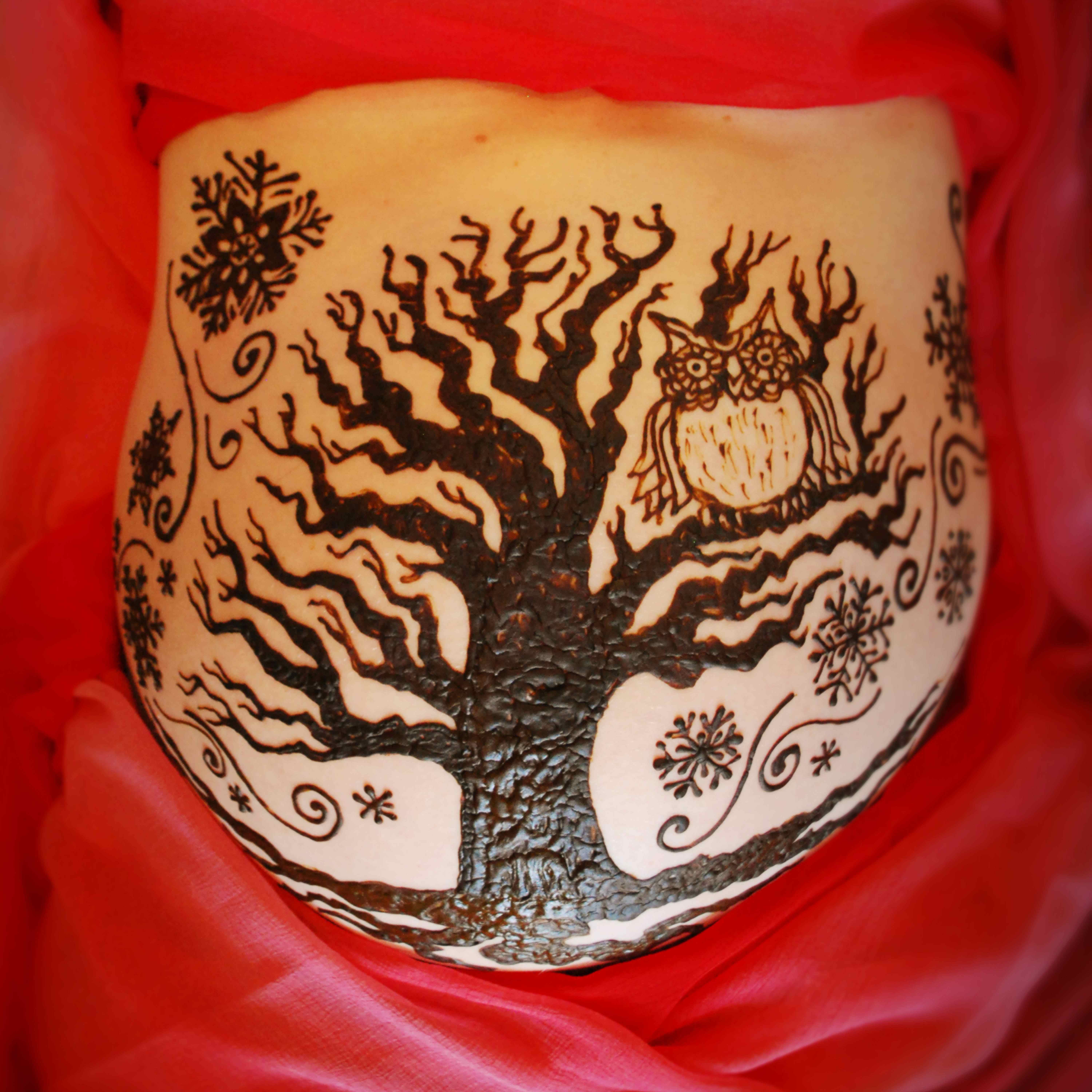 I got a henna tattoo on my belly on Saturday. I’d heard of a few people doing it, and a lady in my yoga class had one done last week and showed it to us all. It was beautiful! The lady who does them only does pregnant lady’s bellies. She calls it ‘henna pampering’. It was fun to pick out the design and just lay there while she drew it on my tummy. Before she came I’d perused her designs online and was really drawn to floral designs. But when she was here and I was looking through her books, she had a sheet of snowflakes and I decided that maybe a tree and snowflakes would be appropriate, since I’m having you in the middle of winter, and since it’s my favorite season. So we decided on a winter tree – with no leaves – and snowflakes. I also wanted a bird or animal for some sign of life, to represent you, so I selected an owl. The final outcome was amazing.
