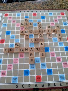 When we got home I had laid a Scrabble board out and written the news on the board. We are semi-frequent, semi-competitive (i.e. I get really angry if I don’t win) players and this was an original, personal way I thought of telling him. On the board, although scattered all over, I wrote the slightly incomprehensible message ‘Get ready for our next big adventure. Congratulations, we are pregnant!’ (of course no punctuation).